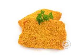 Opengesneden filetlapje van het varken, gevuld met ham en kaas en omhuld met paneermeel.